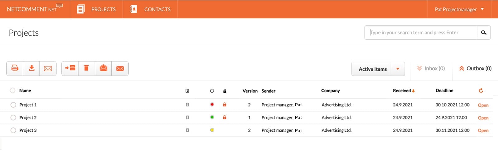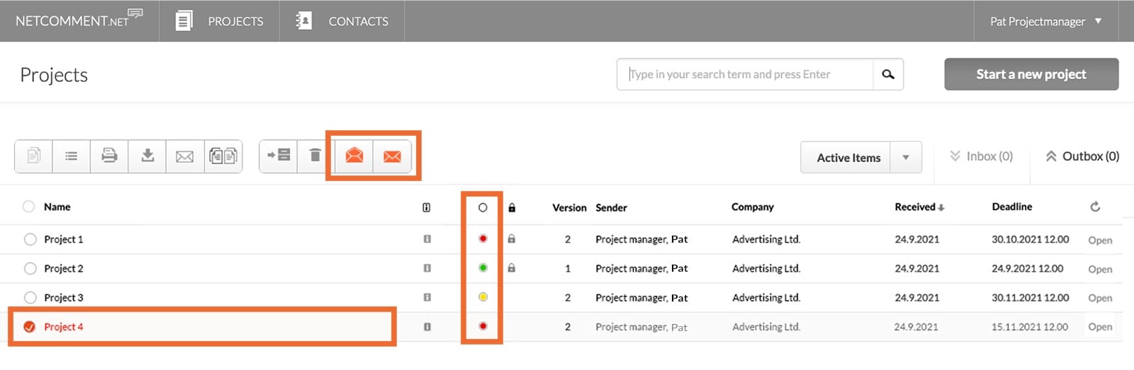 The project status ball flashes and the project bar is highlighted whenever new comments are received (pages approved or rejected). The highlighting disappears when you open the project, you can also delete or set the highlighting with the ”Mark as unread” / ”Mark as read” functions above the project list.