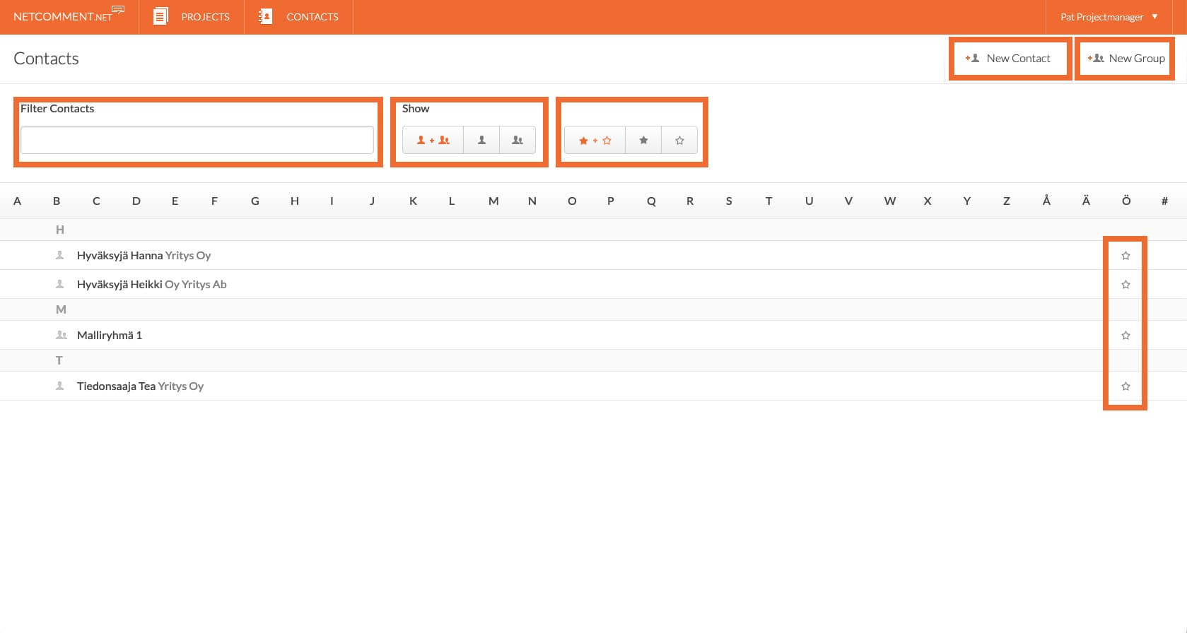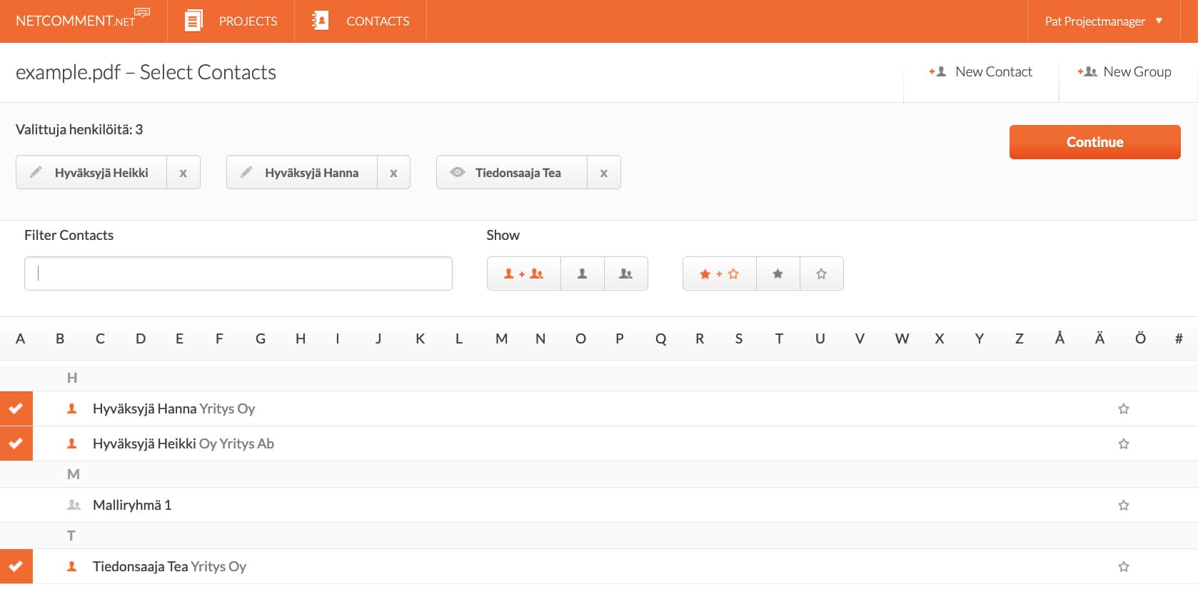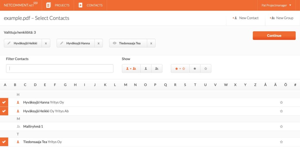 Add people to the contact list to send them materials for commenting. You can also create ready-made contact groups, where you can also define the default roles of group members in projects. You can also set up contacts and contact groups when setting up new projects.