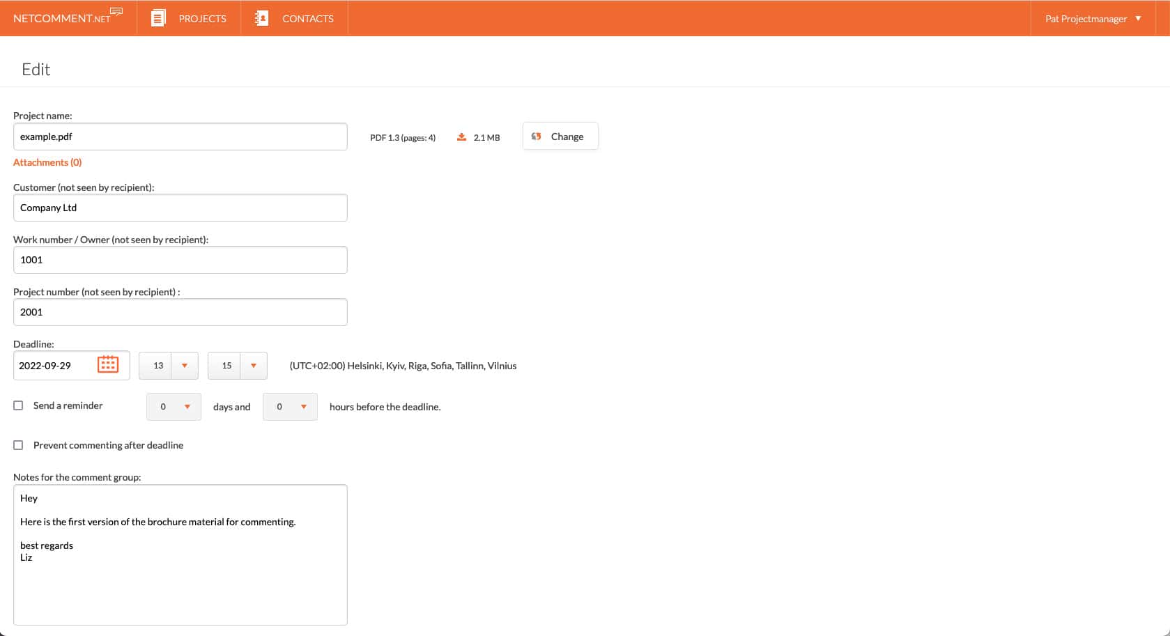 Important data fields include the name of the project, its deadline and any reminders, the blocking off of comments after the deadline, and the accompanying text that will appear in one way or another to other members of the project team.