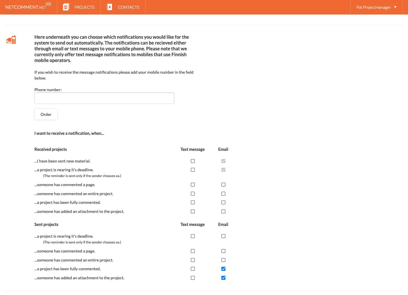 Choose yourself as the owner of the project. This allows you to filter only your own projects into the project list and receive emails and / or text messages about the progress of your project according to your personal ”My Page” preferences. The standard signature you enter in the ”My Page” settings will also be included in the accompanying text of the projects you have created.